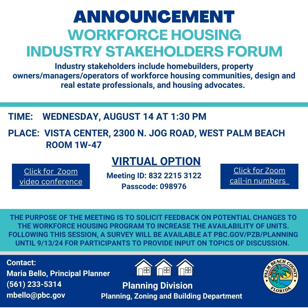 On August 14, 2023 at 1:30 p.m., the Planning Division will be hosting a Workforce Housing Industry Stakeholders Forum at the Vista Center in West Palm Beach. Industry stakeholders include homebuilders, property owners/managers/operators of workforce housing communities, design and real estate professionals, and housing advocates.